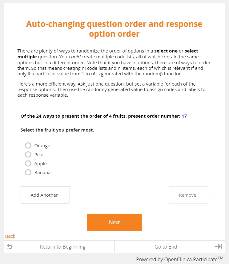 The good news is that surveyors (and data managers) have tools to mitigate these biases. Modern EDC allows you to systematically vary both question and response option order, either by randomly selecting from a set of all possible permutations, or rotating through a block of permutations one participant at a time. The practice, called counterbalancing, guards against unwanted order effects.