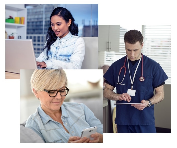 A clinical research associate, researching queries and verifying source data at their workstation or on a mobile device
