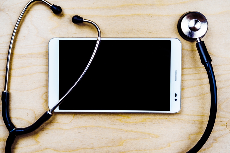 Stethoscope with a tablet computer on wooden table. Medical background