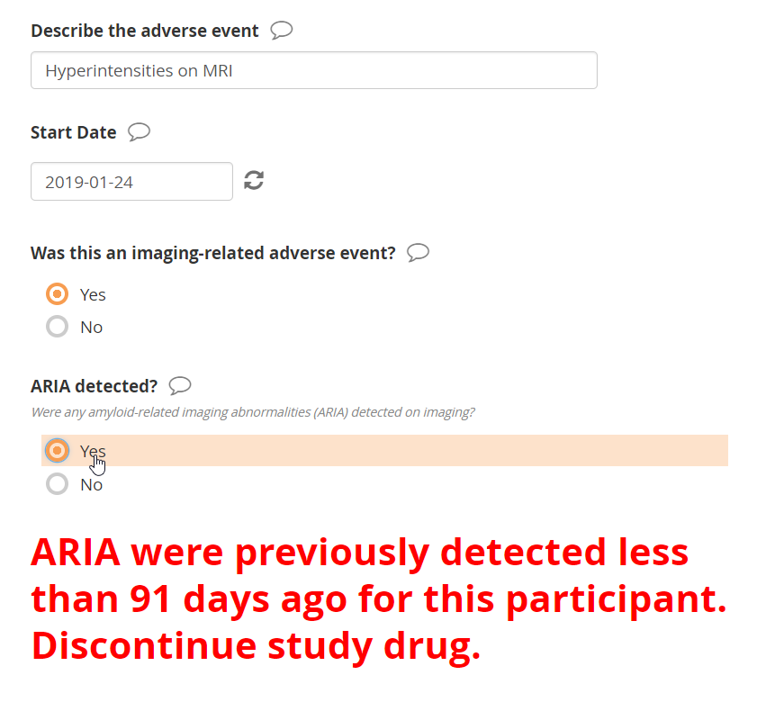 Consider a study that requires drug cessation if a certain adverse event recurs within 90 days. For an Alzheimer’s study, that adverse event may be detection of ARIA (amyloid-related imaging abnormalities) on an MRI scan. Suppose that a second presentation of ARIA within 90 days of the first means that the participant must discontinue study drug. What better occasion could there be for “checking the records” than while reporting a new ARIA? Checking the records here means: